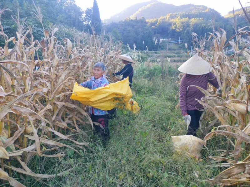 另一边的岚关村,玉米地里是另一番热火朝天的景象。农户们头戴草帽、手提袋子,弯腰穿梭在玉米行间,熟练地掰下饱满的玉米棒,装满的袋子在田埂上排成“长龙”。