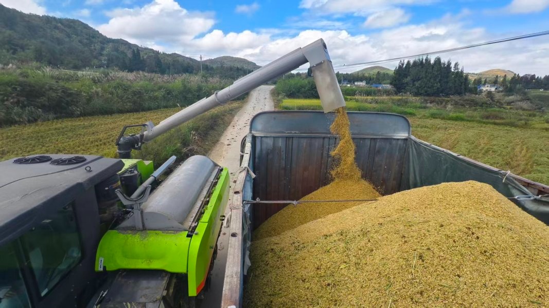 茶海村的稻田里,金色稻浪随风起伏,沉甸甸的稻穗压弯了稻秆,空气中弥漫着沁人的稻香。收割机在田间来回穿梭,切割、脱粒、秸秆粉碎等工序一气呵成,一垄垄稻谷迅速变为金灿灿的谷粒,直接被转运车辆送往合作收购公司。