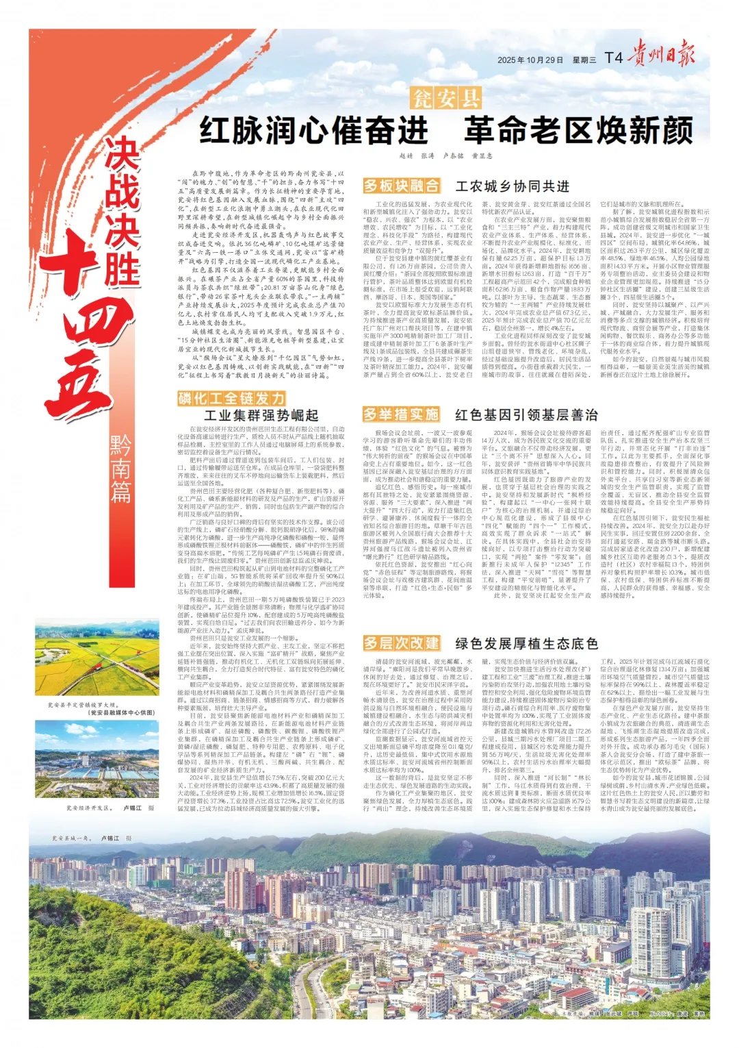 今天,【贵州日报】第T4版,推出特别报道《红脉润心催奋进 革命老区焕新颜》,关注瓮安作为革命老区以“闯”的魄力、“创”的智慧、“干”的担当,奋力书写“十四五”高质量发展新篇章。作为长征精神的重要孕育地,瓮安将红色基因融入发展血脉,围绕“四新”主攻“四化”,在新型工业化浪潮中勇立潮头,在农业现代化田野里深耕希望,在新型城镇化崛起中与乡村全面振兴同频共振,奏响新时代奋进最强音,具体如下: