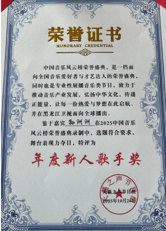 祝贺!孙洲洲荣获2025年中国音乐风云榜“年度新人歌手奖”