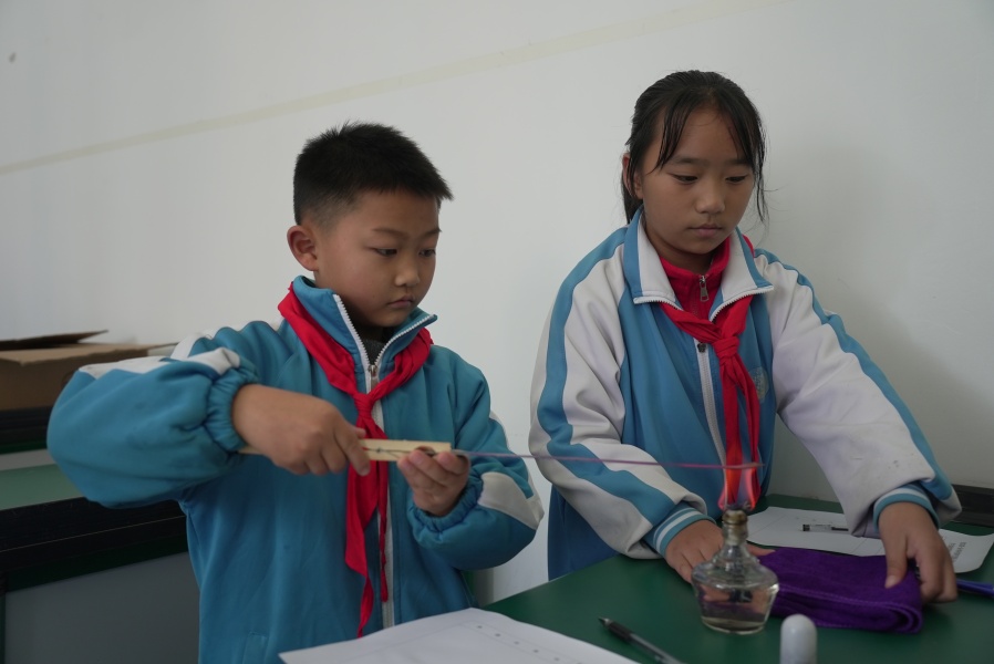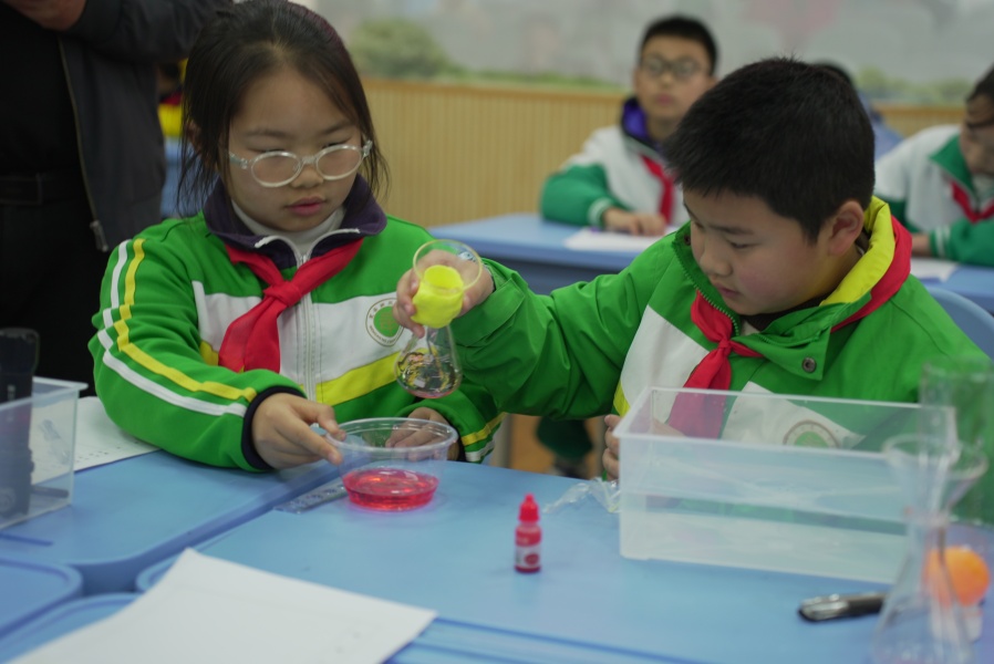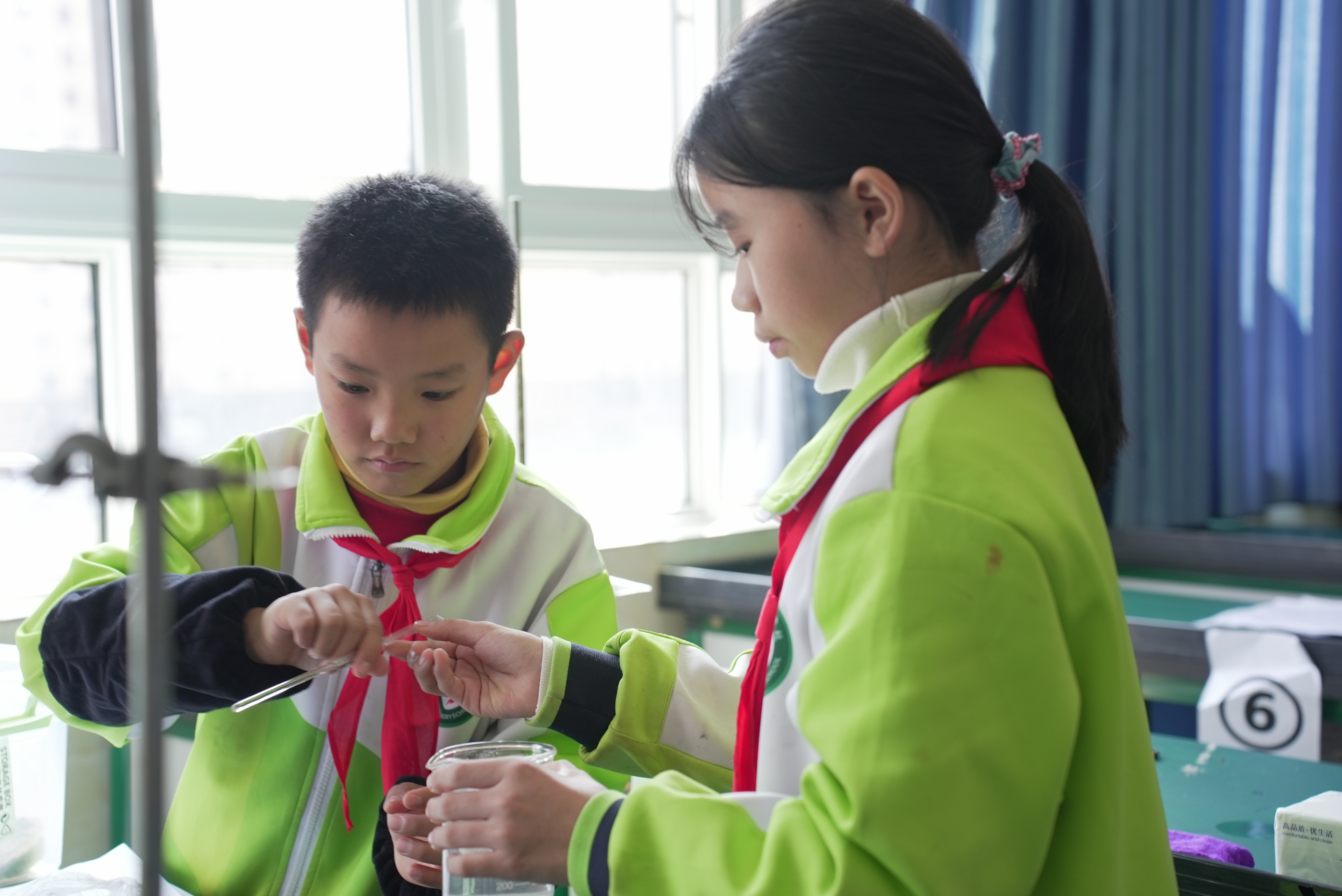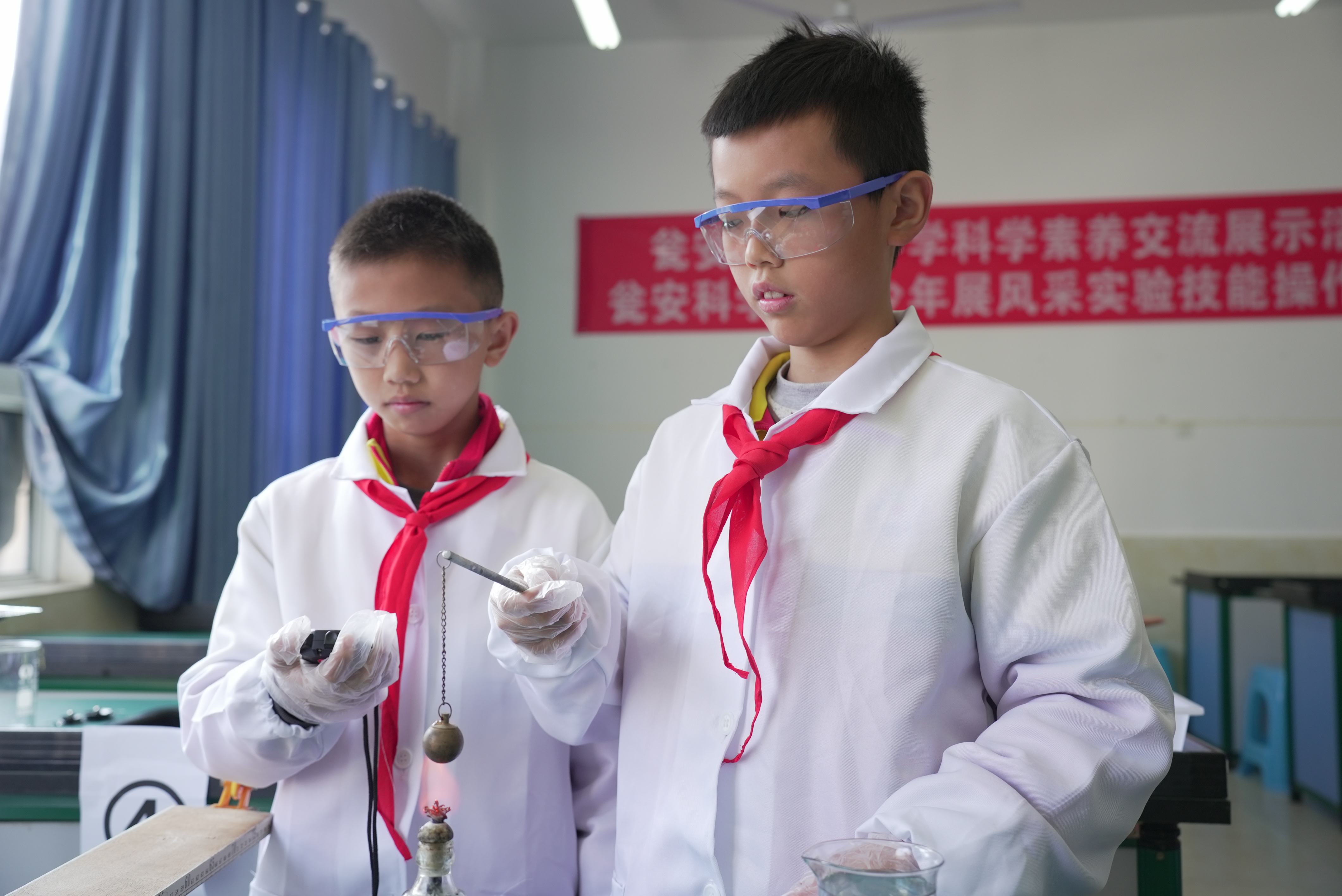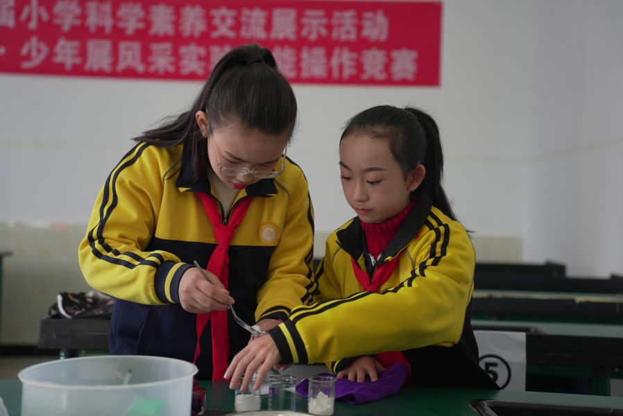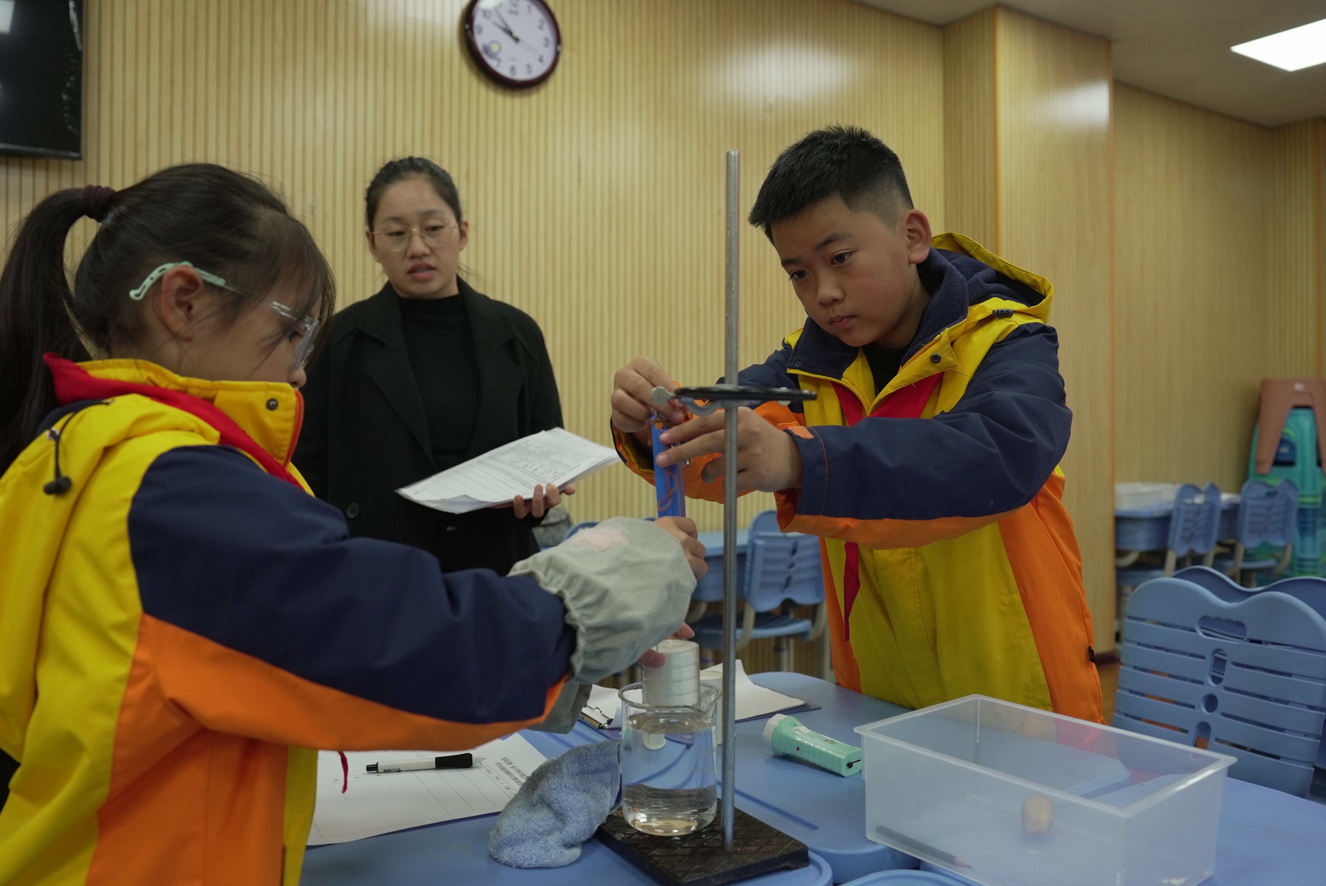 实验技能操作区成为学生实践能力与创新思维的展示核心。必做实验中,三年级学生专注测量降水量、探究物质溶解性;四年级学生细致分析食物营养、尝试点亮小灯泡;五六年级学生沉浸式开展模拟火山喷发、制作简易电磁铁等操作。孩子们严格遵循规范检查器材、执行步骤,认真记录每一组数据,在安全前提下有条不紊完成全流程。选做实验环节更显创意迸发,烧杯、酒精灯等器材成为 “创新道具”,学生们跳出课本局限,自主设计 “不同材质导热性探究”“自制简易净水器” 等方案,小组合作中讨论声、发现新现象的欢呼声此起彼伏。评委们围绕实验原理认知、操作规范性、结果分析等维度细致打分,对孩子们的扎实素养与创新思维给予充分肯定。