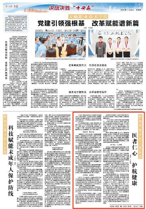 11月28日,贵州日报第10版刊发《黔南州瓮安县人民医院:医者仁心 护航健康》一文,报道了瓮安县人民医院以“三级甲等综合医院”创建为目标,在“十四五”期间,下好改革发展、专科建设、人才强基“三步棋”,推动医院从规模扩张向内涵建设转变,让百姓健康路上有了坚实“医靠”。