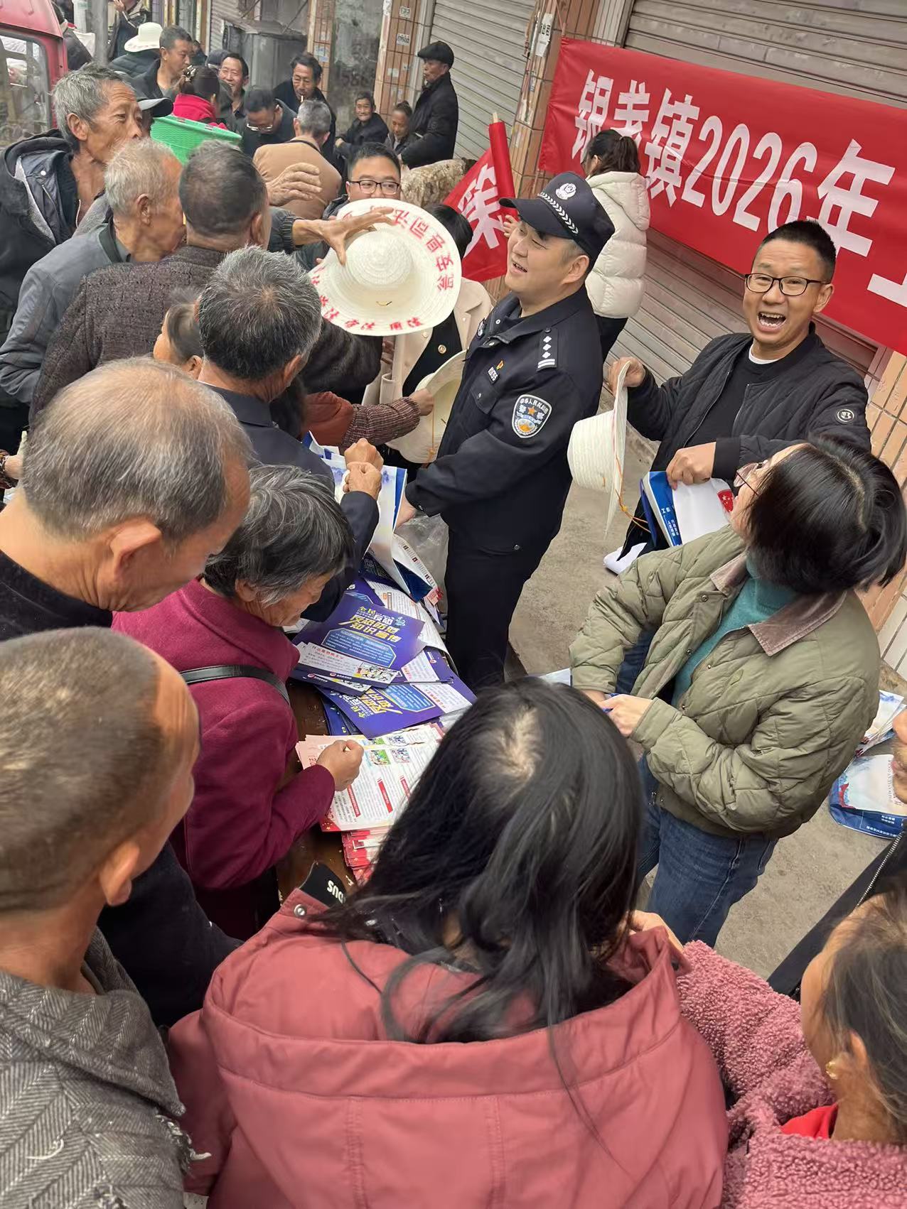 趁着赶场天人多热闹,一大早,银盏派出所的民警就扛着宣传资料来到集市,找了个人流最集中的地方搭起展台。桌上摆满了反诈、禁毒、交通安全的小册子,刚摆好就吸引了不少赶场的乡亲围观。