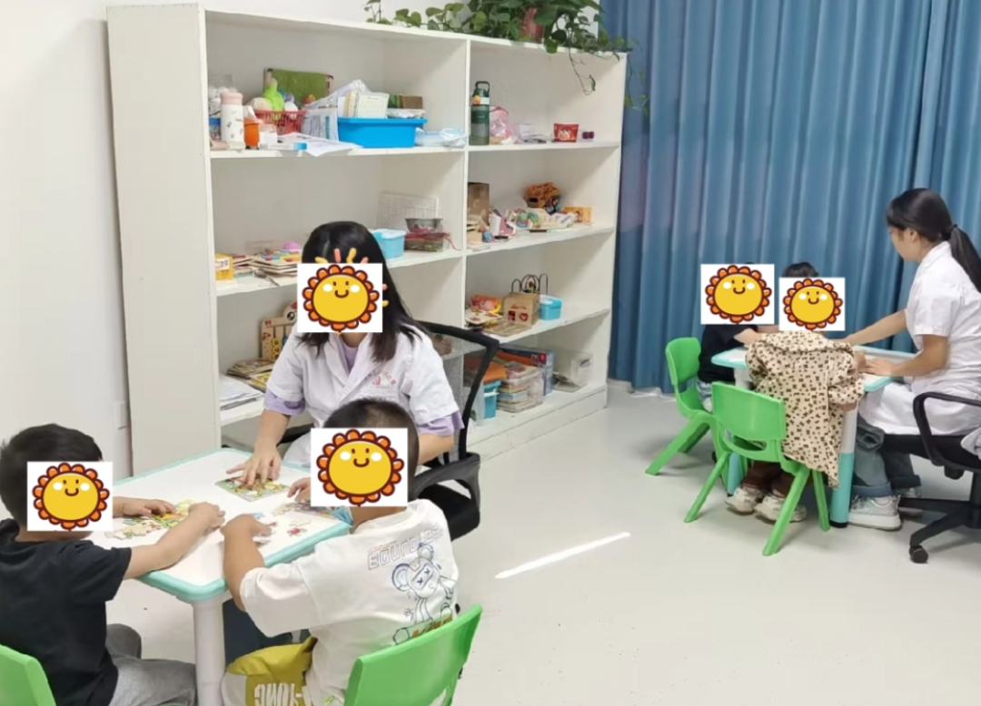 一位言语治疗师正半蹲在小课桌前,用夸张而清晰的口型引导一名幼儿模仿“爸爸”“妈妈”的发音;旁边,另一位治疗师手持图片卡片,耐心鼓励一名稍大的孩子用词语描述画面内容。孩子们稚嫩的跟读声、治疗师温柔的肯定声,让这个充满童趣的空间既专注又温暖。
