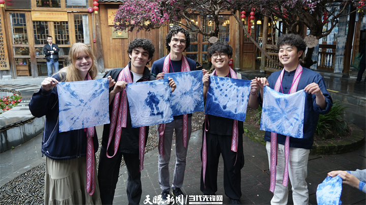 走进肇兴侗寨,耶鲁学子们开启了一场深度文化体验之旅。从鼓楼建筑到银饰纺织,从千年大歌到侗戏器乐,在文化展示中心,他们触摸了侗族文化的源远流长,亲手感受蜡染这一古老技艺的温度。在信团鼓楼前,他们体验了打糍粑;在仁团鼓楼的火塘边,他们与侗族乐器传承人陆东辉围坐交流,即兴学习牛腿琴、琵琶等传统乐器。