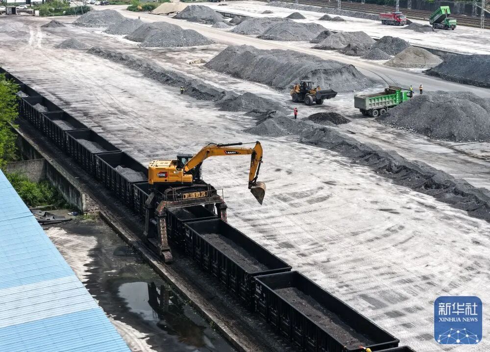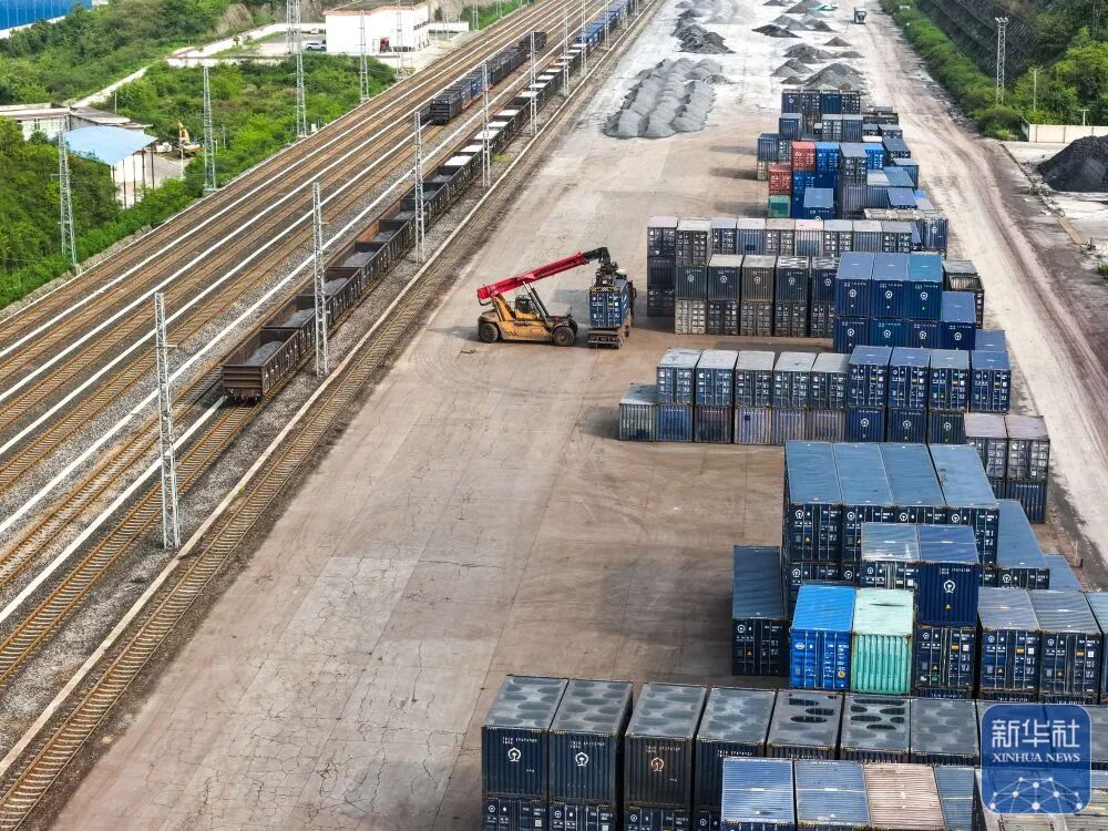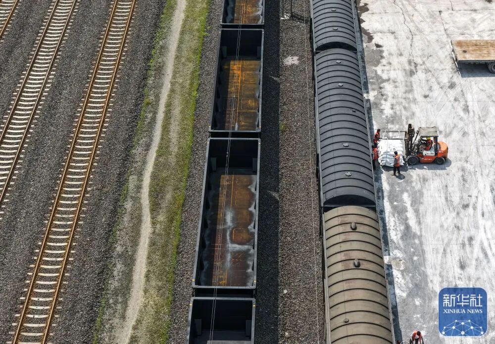 4月16日,在贵州瓮马铁路牛场站,中铁二十局瓮马铁路运营分公司的工人在转运化肥原材料(无人机照片)。新华社记者 杨文斌 摄