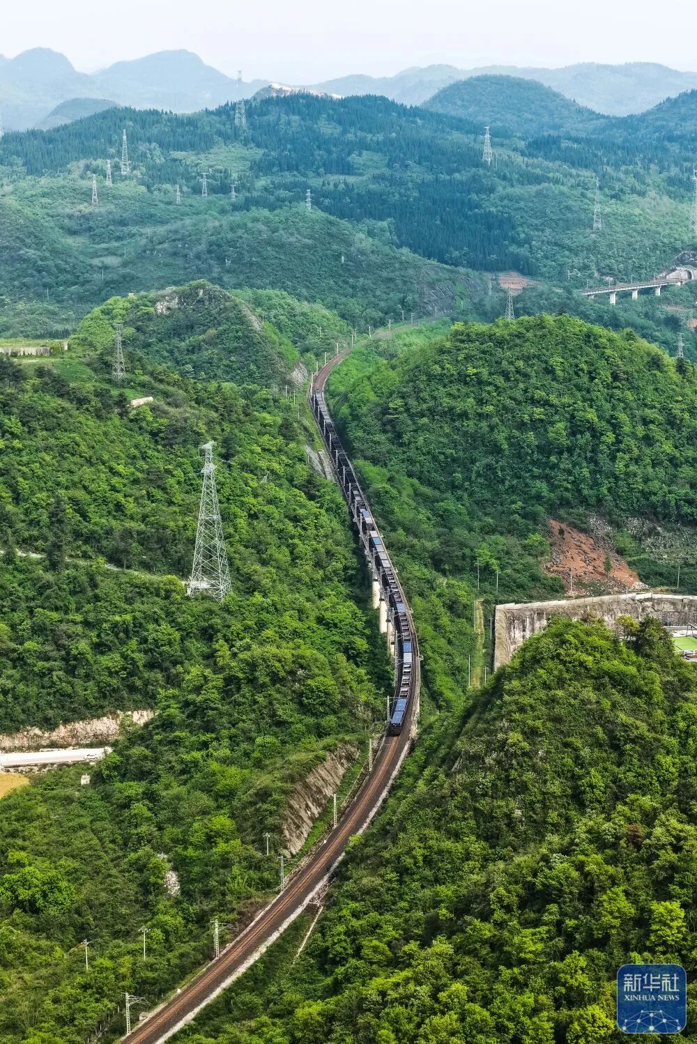 4月16日,运输化肥原材料的列车在贵州瓮马铁路上行驶(无人机照片)。新华社记者 杨文斌 摄