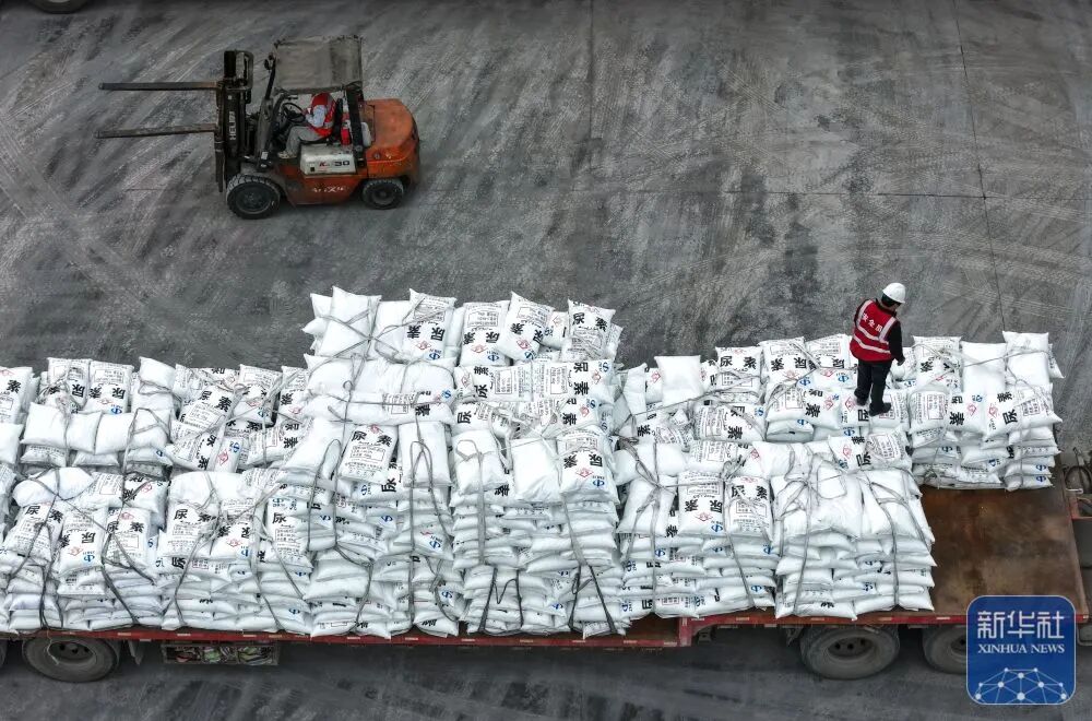 4月16日,在贵州省瓮安县一化肥生产企业,工人将化肥装车(无人机照片)。新华社发(肖伟 摄)