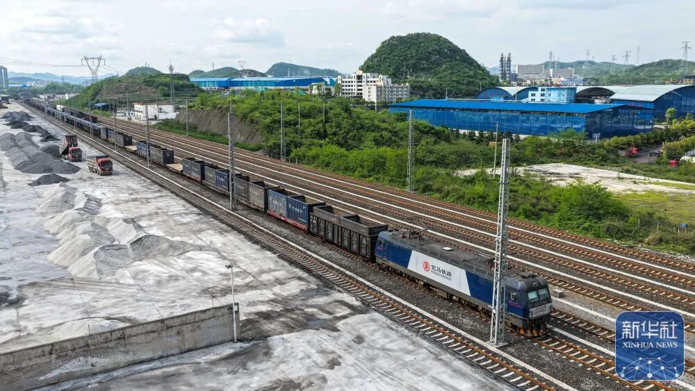 4月16日,一列运送化肥等农资的列车停靠在贵州瓮马铁路牛场站(无人机照片)。新华社记者 杨文斌 摄